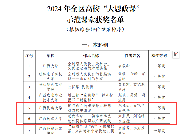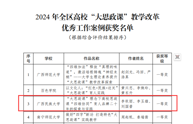 9月3日,自治区教育厅公布了2024年全区高校“大思政课”教学改革优秀工作案例和示范课堂征集活动获奖名单,williamhill李秋丽老师团队获2024年全区高校“大思政课”教学改革优秀工作案例一等奖,梁桂云老师团队、刘业凤老师团队获2024年全区高校“大思政课”示范课堂一等奖,刘美杏老师团队获2024年全区高校“大思政课”示范课堂二等奖。