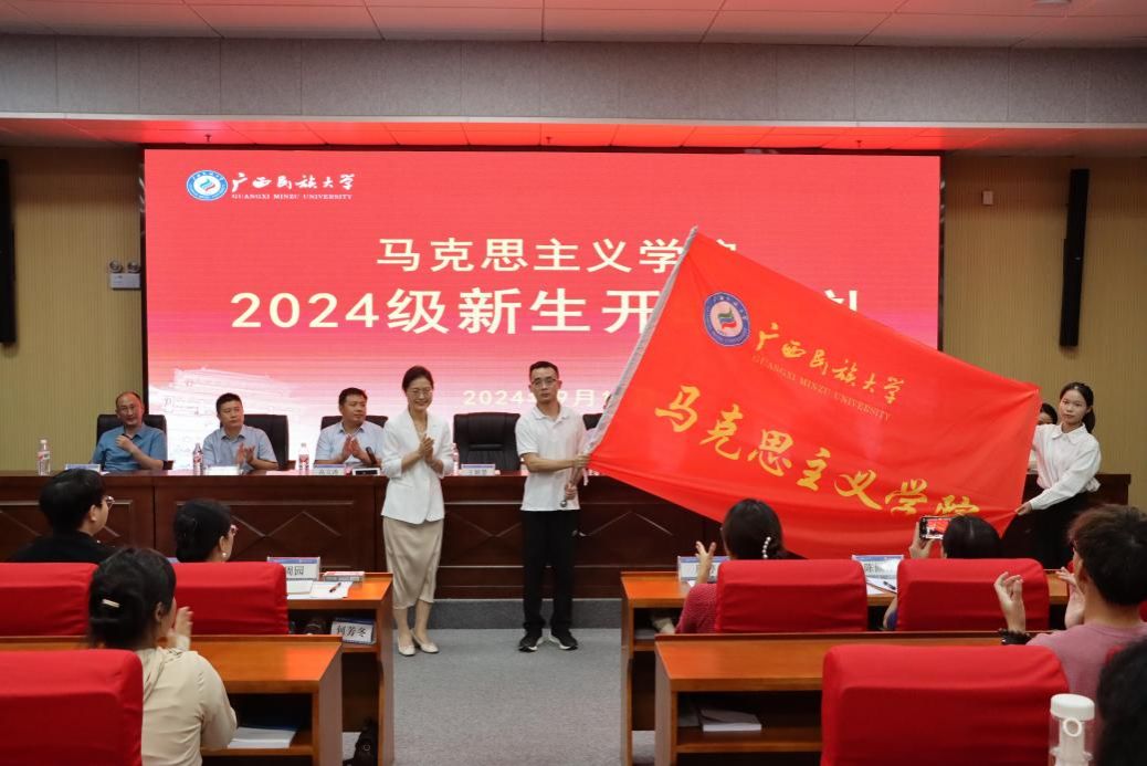 公司党委书记王颖慧为新生代表授院旗,欢迎新生的到来。