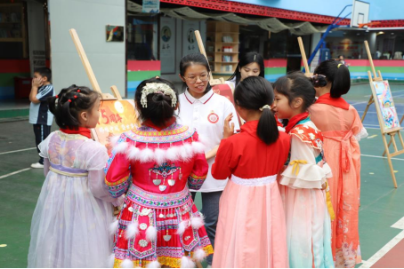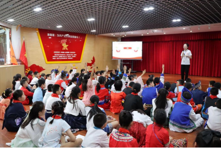 在民族团结进步教育主题宣讲环节,宣讲团成员针对小员工的年龄特点和认知水平,采用图文并茂、知识抢答等生动有趣的方式,深入浅出地讲述了民族特色文化、革命先驱精神以及民族团结的重要性。宣讲团成员用“红石榴”这一形象生动的比喻,描绘了民族团结的美好画面,并讲述了韦拔群等革命先驱不畏艰险、投身革命的感人事迹。宣讲最后,师生们共同唱响歌曲《爱我中华》。